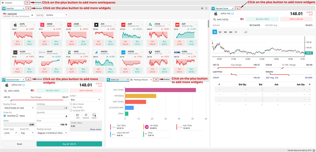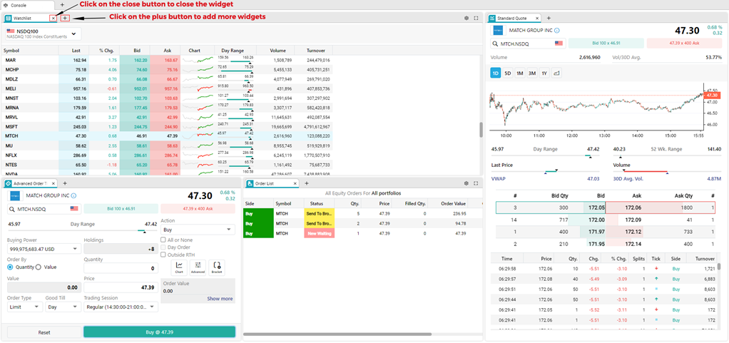 - Console is comprised of Watchlist, Advanced Order Ticket, Order List and Standard Quote. But it can be configured according to your preference by adding more widgets to the workspace or removing the existing widgets. You can add more widgets to the workspace by clicking the plus button. Similarly, you can remove existing widgets by using the close button located at the top left corner of each widget.