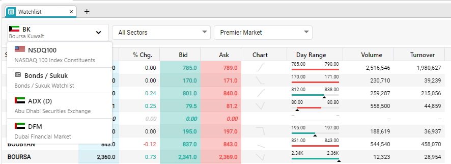 - The watchlist selector drop-down is located within the watchlist widget in the console and can be used to view the complete list of symbols in a particular market/ exchange (i.e. DFM, NYSE, etc.) or a user-created watchlist.