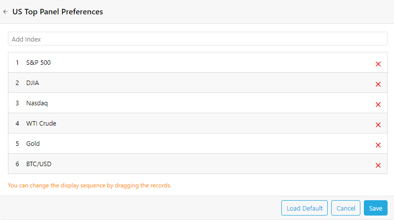 - Note: Apart from indices, you may also add commodities (i.e. Gold, Silver, etc.) to the US top panel index list.