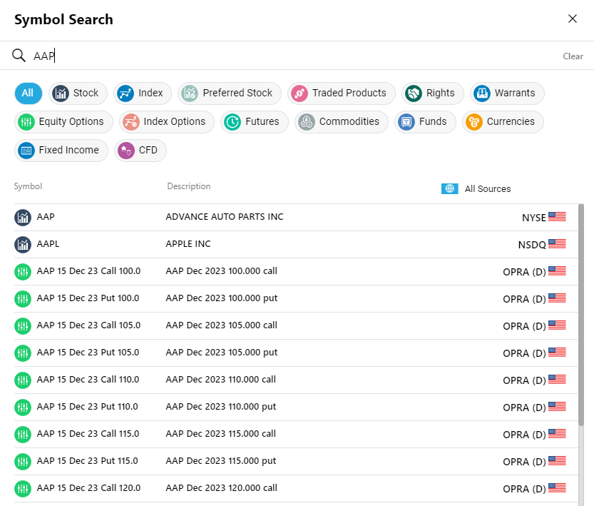 - You can filter the search results by Stock, Index, Equity Options, Traded Products, Commodities, Futures, Funds, Currencies, Fixed Income, Money Market, Warrants, Crypto, CFD.