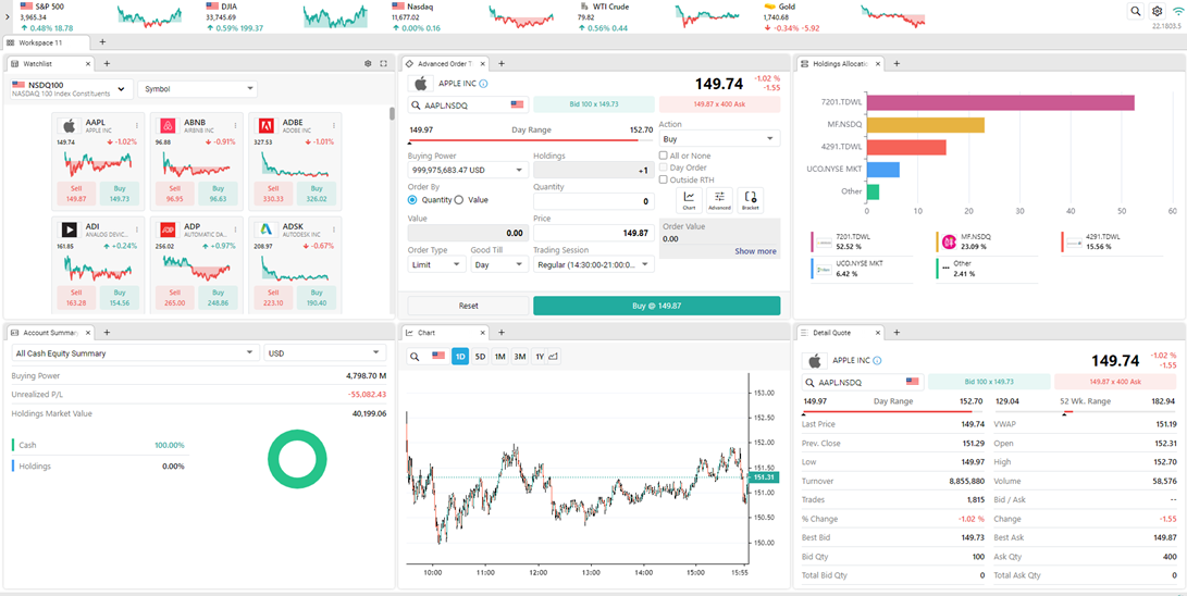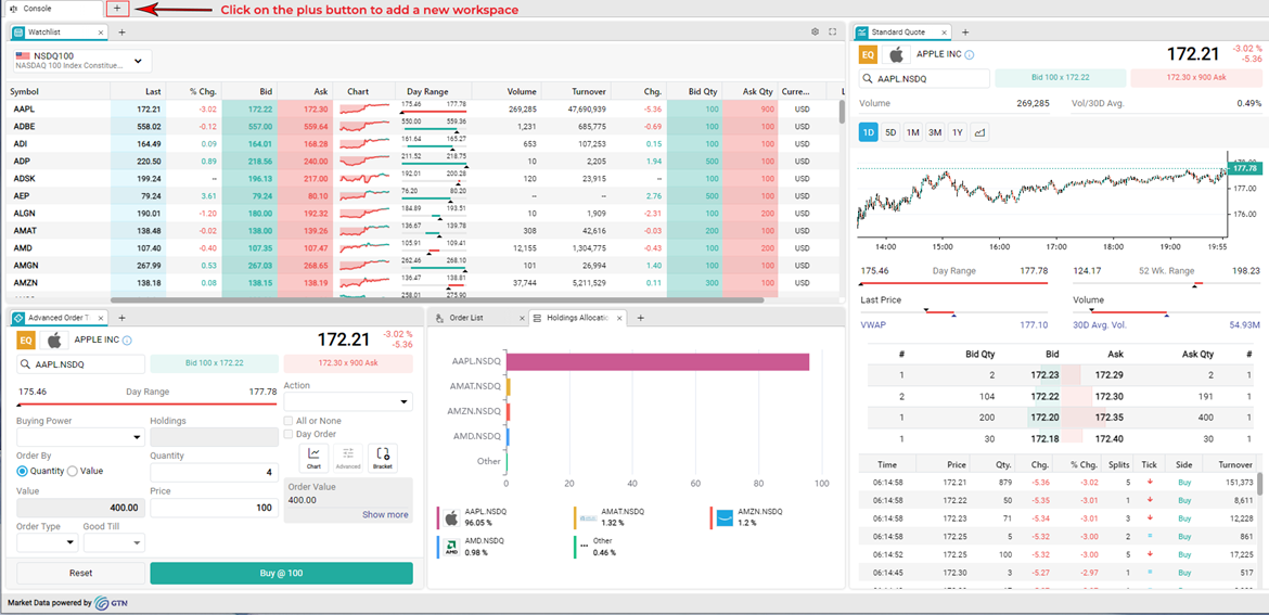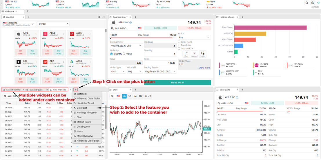 Using this layout, you can select six different widgets you prefer to work on simultaneously that will fit in the given containers. Select the feature you wish to view by clicking on an icon in the middle of the widget. You can use this layout to view watchlist, Advanced Order Ticket, Lite Order Ticket, Order List, Holdings Allocation, Account Summary, Chart, Market Depth, Detail Quote, Standard Quote, Time and Sales, News, Stock Overview and Advanced Order Book.