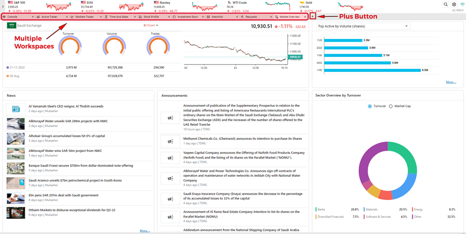You can add more workspaces or add more widgets to the containers by clicking on the button(refer to the figure below) and selecting the feature you wish to add.